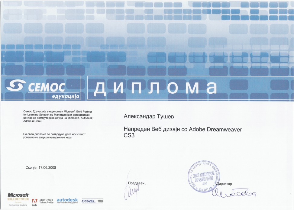 - Проектирање на повеќе компаниски web портали и e-office апликации - ангажиран од GeoWild Mak, Geofoto Zenit, Комора на овластени Геодети, GlobalSec, Ambient HR, Geodet, Geometar ProIng и др;